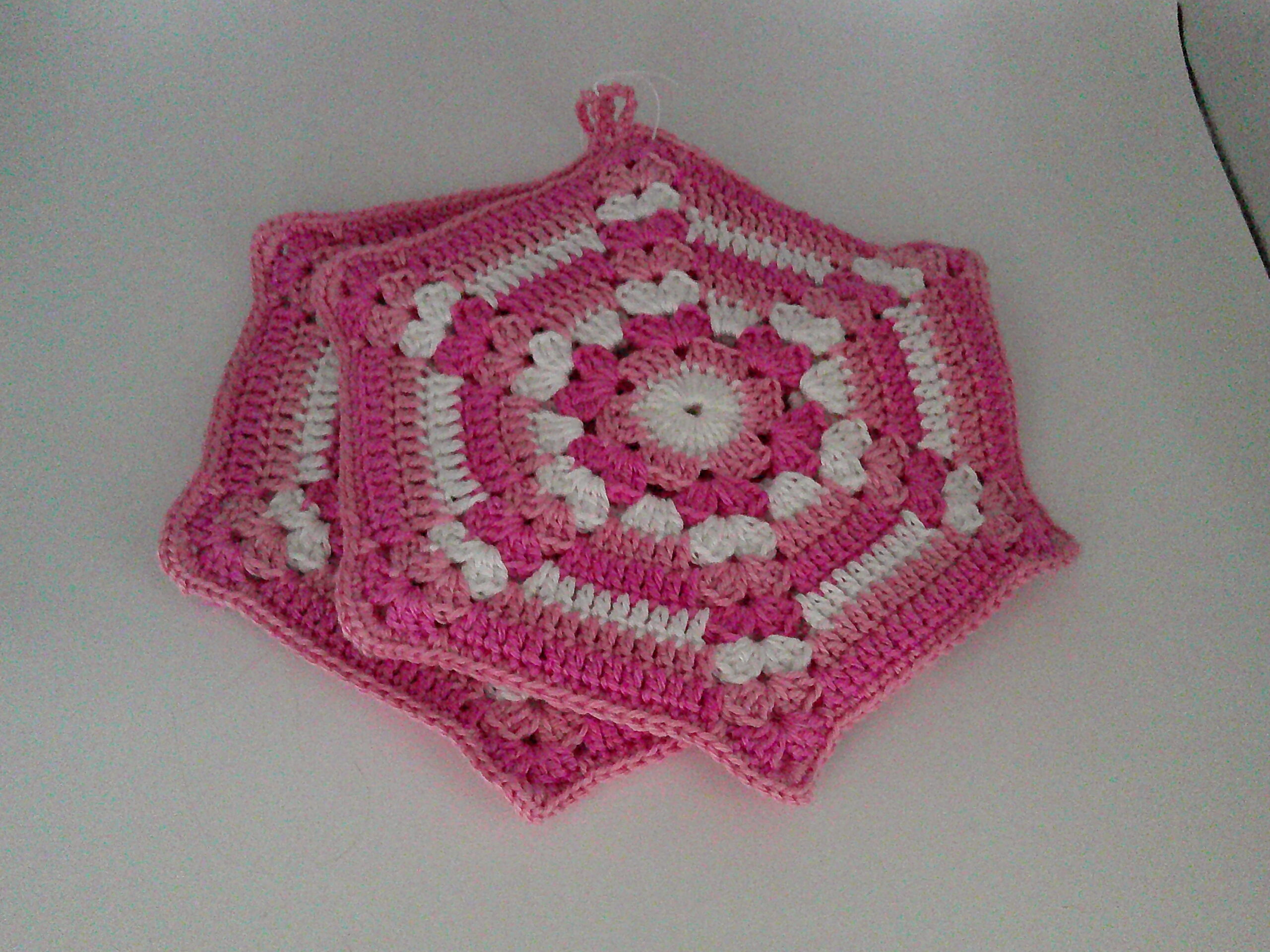 Leuk hand gehaakte pannenlappen voor in de keuken.De set bestaat uit 2 pannenlappen in de kleur licht bruin/wit/bruin.In vele kleuren verkrijgbaar.Indien wenselijk ook op bestelling te maken.Kan gewassen worden op 40 graden.